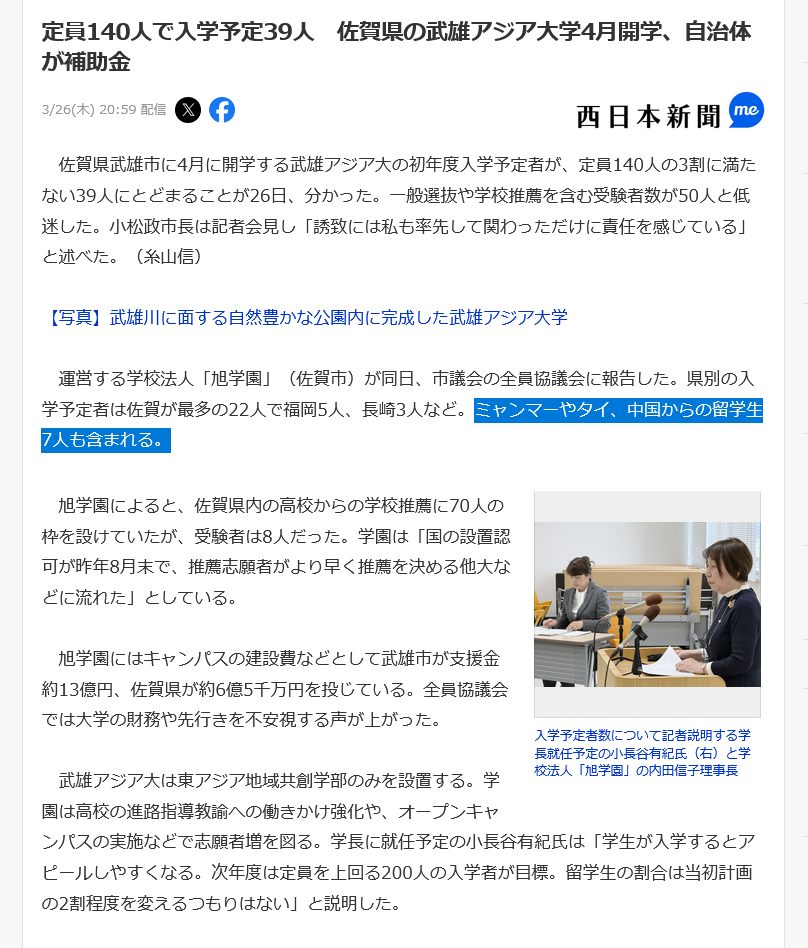 | 002 | 名無しさん | 2026/03/30(月) 13:52:59 | しかも、39人が韓国からの留学生とか | 画像なし |