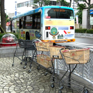 買い物カゴを床に置いての場所取りです。レジに並ぶ際は、列の最後尾を確認し、