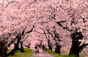 「桜のトンネル」のように。強い風が吹く中、観光客や