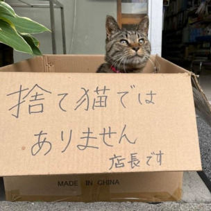「捨て猫ではありません 店長です」文具店の店頭で、